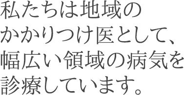 当院には、インフルエンザや風邪などの日常よくある発熱や腹痛、吐血、下血、体がだるい、食欲不振、貧血、急激にやせる、黄疸、熱中症などいろいろな症状の患者さまが来院されています。